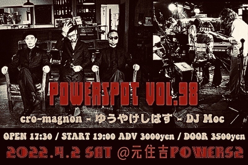 アンダーグラウンドを席巻する日本が世界に誇るダンスミュージックバンドcro-magnonと神出鬼没のロックバンドゆうやけしはす、そしてDJ MocによるPOWERSPOT Vol.98開催決定!おーどーれー!!