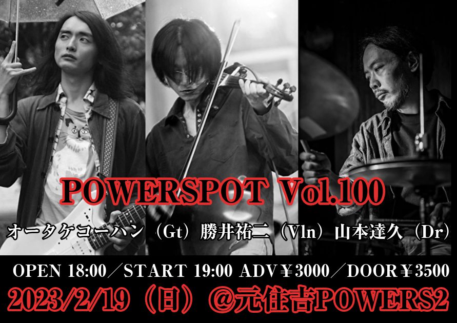 LAGITAGIDAやあら恋で活躍するギタリスト・オータケコーハン、ROVOの勝井祐二、超絶ドラマー山本達久による予測不能&制御不能の完全即興LIVEが実現!POWERSPOT Vol.100に相応しい強力なメンバーでお届けします!お楽しみに☆