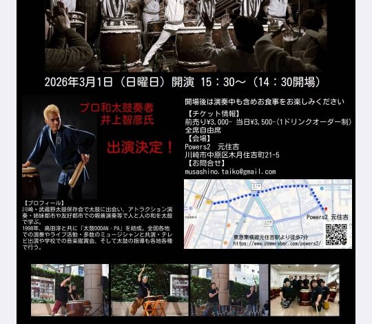★ 武蔵野太鼓保存会LIVE at Powers2★ 2026/03/01 (日)@元住吉Powers2 OPEN14:30 / START…